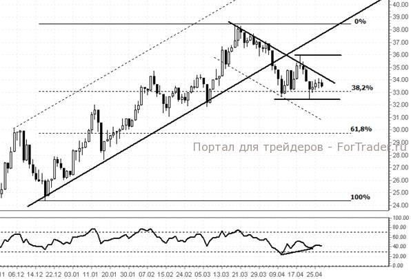 С точки зрения технического анализа, график цены продолжает находиться в рамках краткосрочного нисходящего канала. В случае пробоя вниз уровня поддержки $32,46, возможно дальнейшее снижение к ценовой отметки $30 за акцию. При пробое вверх линии сопротивления нисходящего канала, мы ожидаем роста цены к следующей цели $36 за акцию. О возможном тестированиии на прочность линии сопротивления, свидетельствует дивергенция на индикаторе RSI.