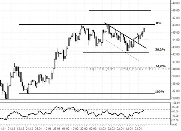 С точки зрения технического анализа, после пробоя вверх линии сопротивления краткосрочного нисходящего канала, график цены практически достиг основного уровня сопротивления $46 за акцию. При пробое вверх уровня сопротивления, следующей целью будет ценовая отметка $48 за акцию. О возможной коррекции перед пробоем вверх свидетельствует нахождение индикатора RSI в пределах зоны перекупленности.