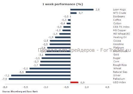 Доминирующим фактором на рынке остается европейский долговой кризис. Поэтому сырьевые инвесторы обеспокоены, что замедление мирового экономического роста может привести к снижению спроса на сырьевые материалы. Индекс Reuters Jeffries CRB по итогам недели понизился. Потери были зафиксированы по всему спектру рынка, особенно в секторе серебра и палладия, в то время как нефть WTI, напротив, смогла показать относительно неплохой результат.