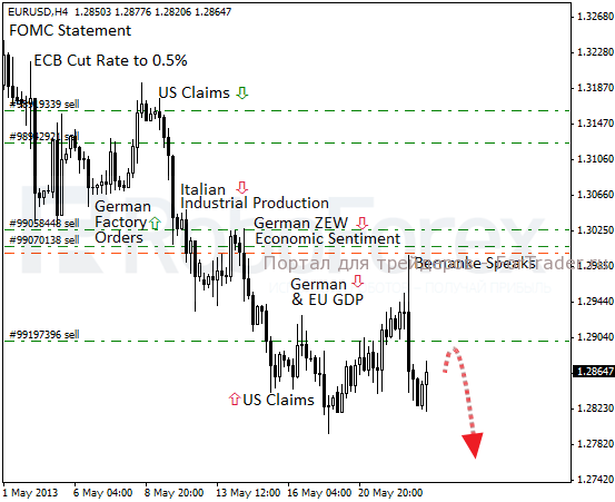 В четверг нас ожидает «продолжение банкета». В первой половине дня выйдет блок статистики по европейским макроиндикаторам PMI. Ожидается небольшой рост показателей, но большинство из них по-прежнему ниже уровня 50, что означает продолжение сокращения. Вечером же будут опубликованы свежие данные по заявкам на пособие по безработице, где прогнозируется снижение показателя с 360k неделей ранее до 347k. Если же показатель сможет снизиться ещё сильнее, то на фоне заявлений Бернанке евро может просесть ещё ниже, потому и продолжаю продавать.