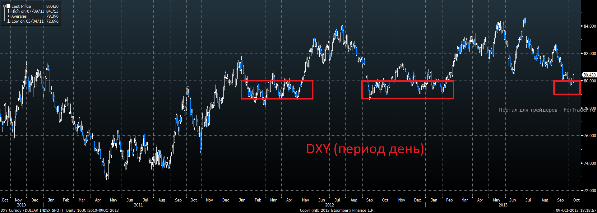 По-прежнему одной из интересных среднесрочных идей на текущий момент является укрепление индекса доллара по отношению почти ко всем валютам. Индекс доллара за последние два года неоднократно приостанавливал своё снижение именно в диапазоне 79-80 пунктов, вот и в среду появились первые намёки на отскок от этих отметок.