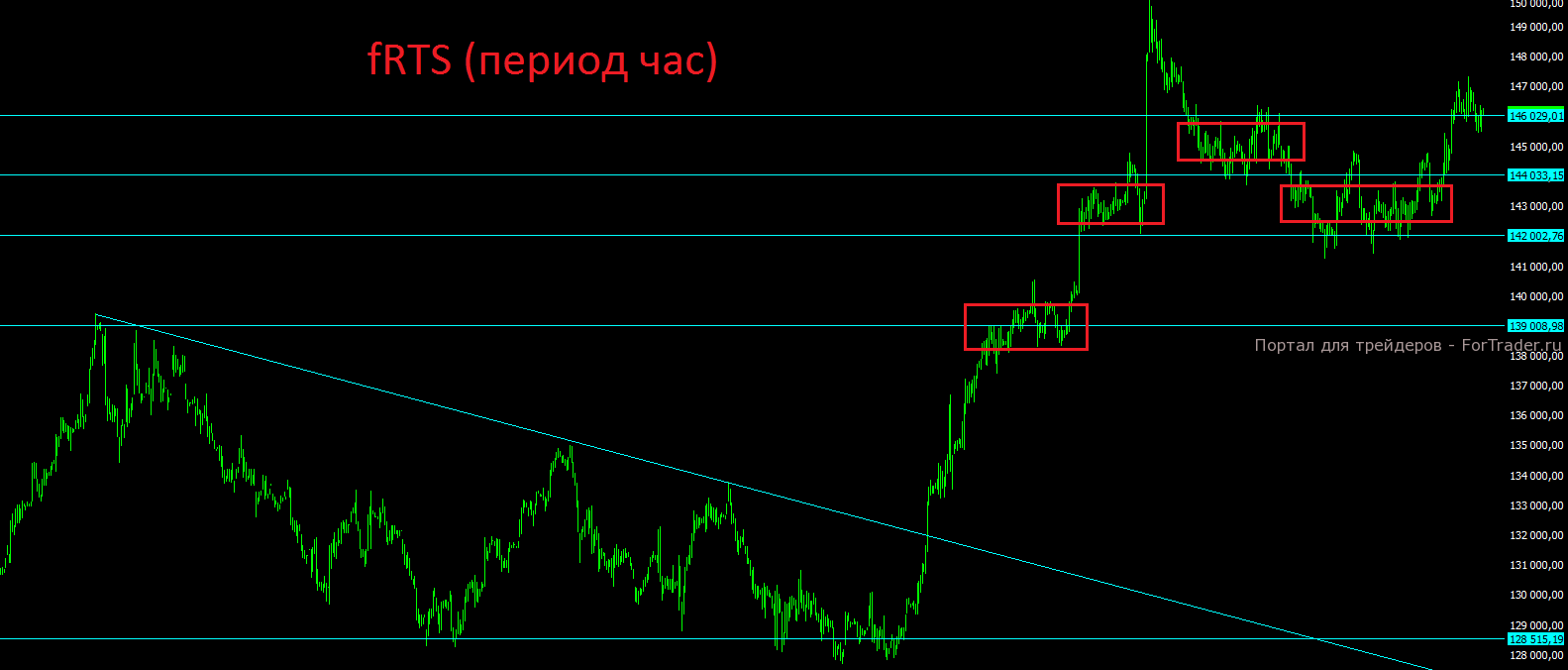 Фьючерс на индекс РТС после выхода вверх из диапазона 144000-146000 продолжает консолидироваться и тестировать в качестве поддержки верхнюю горизонтальную поддержку. Пока цена закрывает день выше отметки 146000 сохраняются все шансы на финальный поход с обновлением предыдущего максимума выше отметки 150000 пунктов. В случае закрытия дня ниже отметки 144000 появятся первые намёки на коррекцию, поэтому стоп по длинным позициям проще ставить именно там. В случае пробоя отметки 142000 можно будет говорить о более глубокой коррекции.