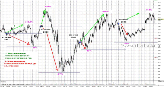И мне все равно удалось сделать интересный вывод. Заключается он естественно не в том, что в трех случаях из четырех после отсечки после небольшой недельной, может быть двухнедельной «болтанки», начинался или продолжался рост бумаг. Интересно то, что за год от уровня закрытия реестра до следующей отсечки бумаги чаще сильнее отклонялись вниз, чем вверх. Но это, опять же, не аргумент для «шорта». Просто, если вы долгосрочный инвестор, любящий собирать дивиденды – вы сильно рискуете. Приведу график.