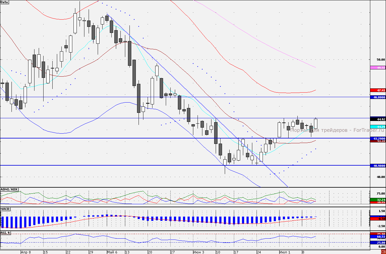 Рост акций НЛМК сегодня происходит вслед за общерыночной динамикой. Акции протестировали на прочность важный рубеж 45,00 руб. Показания трендовых индикаторов не исключают вероятности того, что рост акций может быть продолжен. В частности, индикатор ADMI/ADX показывает, что преимущество находится на стороне покупателей (линия «быков» находится выше линии «медведей»), при этом сигнальная линия MACD (12;26;9) взяла курс к нулевому значению. Так, при сохранении позитивных настроений следующей целью выступит отметка 45,50 руб., далее 46,00 руб. Несмотря на показания трендовых индикаторов стоит подтягивать тэйк-профиты по спекулятивным «лонгам». Наш 30- минутный торговый робот открыл длинные позиции от отметки 43,98 руб.