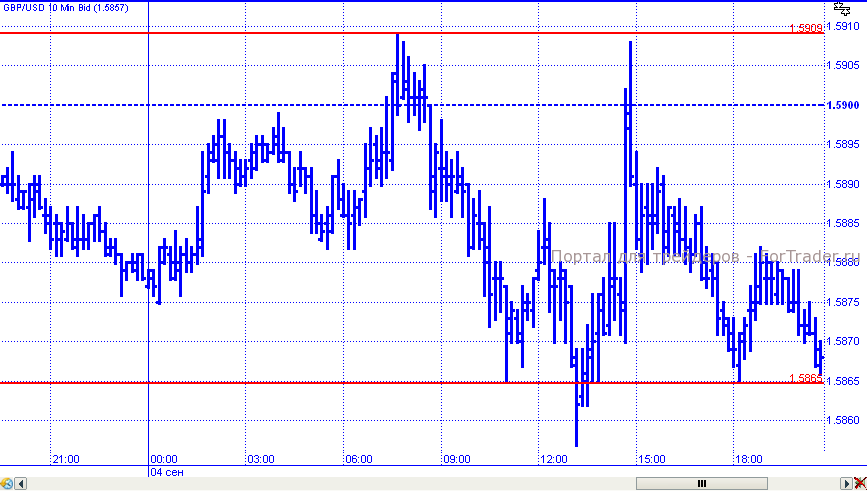 Фунт/доллар большую часть торговых суток удерживался в пределах диапазона 1,5865 – 1,5900. В течение дня цены пару раз предпринимали попытки преодолеть сопротивление 1,5900, но закрепиться выше указанной отметки им так и не удалось. Максимум был отмечен на уровне 1,5909. К закрытию дня цены вернулись к нижней границе канала.