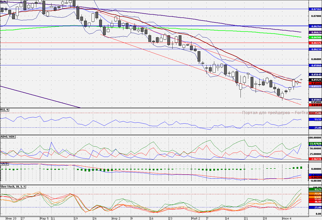 Акции ВТБ вышли вверх из нисходящего канала, но внешний фон не располагает к дальнейшему росту бумаг. Акции могут протестировать отметку 5,5 коп. и далее устремиться к 21-дневной скользящей средней 5,450 коп.
