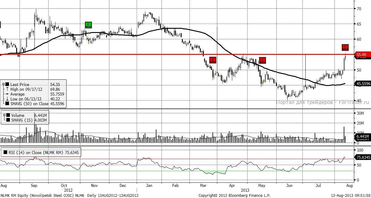 Судя по тому, что за последние пару дней  акции НЛМК существенно прибавили в весе, инвесторы ожидали положительной отчетности. Рост проходил на повышенных объемах, что несвойственно для летнего периода. Среднесрочная техническая картина по-прежнему остается под влиянием медведей, однако следующие правилу «покупай то, что валяется на полу» сейчас имеют хорошую возможность это сделать. С января текущего года акции снизились более чем на 20%, а с пика 2011 года, на 63%, и это является поводом для долгосрочных покупок.