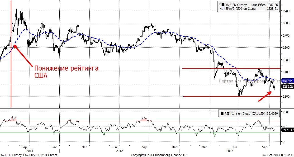 Тогда, в августе 2011 года, наиболее существенный импульс получило золото. Оно начало расти за 2 недели до исторического снижения рейтинга США, заметно подорожало на следующий день, после чего рост продолжался еще месяц. Даже серебро не показывало такой динамики. Ценные бумаги же, как правило, реагировали падением. Волатильность рынка сейчас увеличивается, что учитывает «индекс страха», выросший за вчерашнюю сессию на 2,5%. Если республиканцам с демократами не удастся договориться, это может привести к резким скачкам на рынке, что определенно будет на руку золоту. Вероятный среднесрочный рост ограничен $1430 за тройскую унцию.