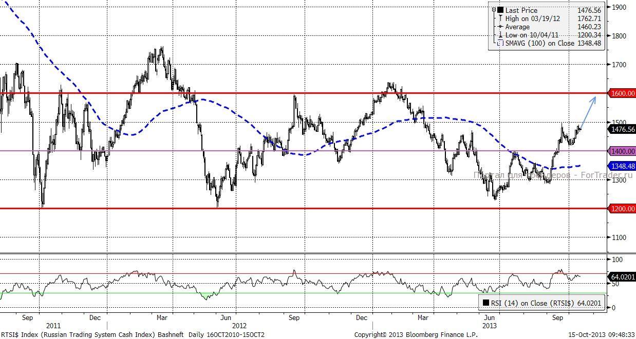 Российский рынок застыл в ожидании решения по потолку государственного долга США. Динамика индекса RTS проходит в среднесрочном боковом направлении 1200 – 1600 п. Возможность индексу подрасти еще остается, но осторожные инвесторы предпочитают не открывать новых позиций. При достижении верхних границ диапазона спекулятивные длинные позиции можно закрывать.