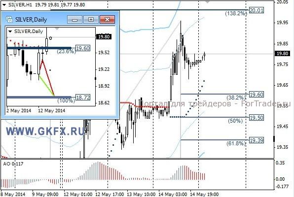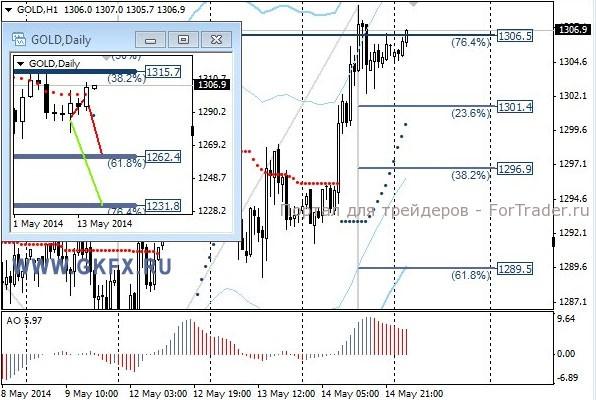 Цены на золото вышли из треугольника противоположно ожиданиям, следовательно, события в Украине продолжают оказывать влияние на золото. Золото поднялось выше уровня 1301,0 и если оно сможет закрепиться выше этого уровня, то рост может продолжиться. В противном случае снижение возобновится. Традиционно делаю два варианта движения цены на неделю, основной красный и альтернативный зеленый. Значимые уровни на сегодня отмечены на часовом графике. Индикатор АО находится в положительной зоне и снижается, указывая на коррекцию перед возможным продолжением роста. Индикатор тренда указывает на рост. Преодоление уровня 1301,0 позволит продать с целями 1298,0, 1295,0 и 1290,0.