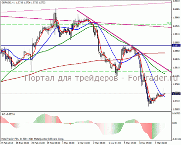 На часовом графике видим возвращение цены в диапазон 1.5877-1.5655 пунктов. После тестирования локальных верхов, цена корректируется в направлении сильной линии поддержки в 1.5655 пунктов, это и есть краткосрочная перспектива. Дальнейшее движение ожидаем в боковом направлении к трендовой линии. Индикатор склоняет к незначительному росту валютной пары к 1.5777 пунктов.