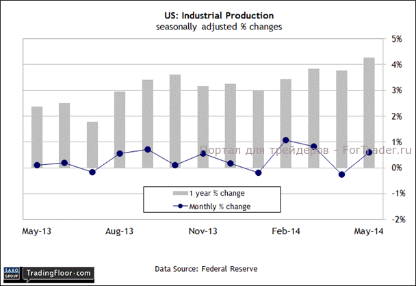Сегодня все внимание будет приковано к отчету о промышленном производстве за июнь, в то время как Джанет Йеллен продолжит свое выступление в Конгрессе. Участники рынка ожидают, что темпы роста производства понизятся до 0,4% по сравнению с результатом прошлого месяца на уровне 0,6%, но в годовом выражении рост должен ускориться до 4,5%. Если прогноз окажется верным, то игроки будут ждать от г-жи Йеллен пояснений касательно срока первого повышения ставки с учетом этой новой информации.