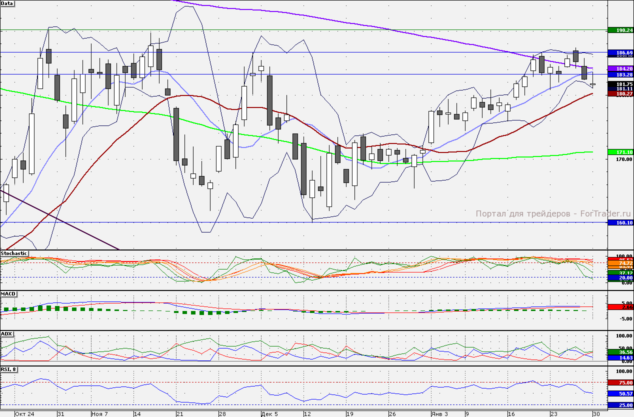 Акции компании в случае продолжения распродаж могут уйти в район 180 руб., где проходит 21-дневная скользящая средняя. Сопротивлением для бумаг является район 184,0 руб., где располагаются 10- и 200-дневные скользящие средние. Вряд ли акции сегодня подвергнутся распродажам, поскольку завтра ожидается отчет компании.