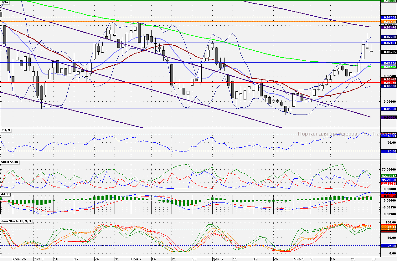 Акции банка закрылись в районе 7,0 коп., что располагает к тестированию 7,160 коп. далее сопротивлением станет уже 7,350 коп. Поддержкой является 6,761 коп. – незакрытый гэп от 26 января.