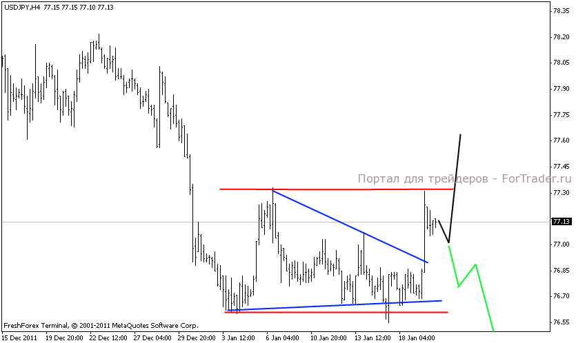 Треугольник о котором говорилось в предыдущих обзорах наконец то был пробит. Это сделали быки.Видимо на это у них ушло много сил, потому как пара тут же начала корректироваться. Ценовой максимум предыдущего движения вверх также не пройдет, поэтому о полной победе быков говорить рано. Цена может возобновить снижение и ситуация кардинальным образом изменится. Поэтому для открытия длинных позиций лучше дождаться пробоя локального максимума.