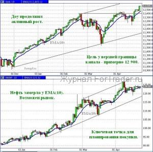 На дневном графике индекс Доу-Джонса ещё на прошлой неделе преодолел важный уровень сопротивления 12 400, но замер на отметке 12 500. Вставал вопрос о том, пробит ли уровень сопротивления или атака «быков» оказалась неудачной. Во вторник Доу рассеял сомнения, нарисовав на графике длинную свечу с максимальной ценой выше 12 600. Теперь можно говорить, что рынок выбрал новое направление движения. Основным ориентиром выступают границы канала, просматривающегося на дневном графике. Цель вверху расположена примерно на отметке 12 900.