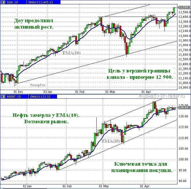Курс EUR/USD медленно движется вверх, возможна небольшая коррекция до скользящего среднего ЕМА(10) на дневном графике. После бурного роста цена на золото совершила такую коррекцию, причём точно до ЕМА, после чего снова пытается двигаться вверх. В этом смысле принципиальных событий на рынке не происходит.