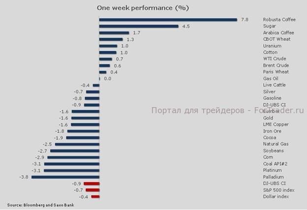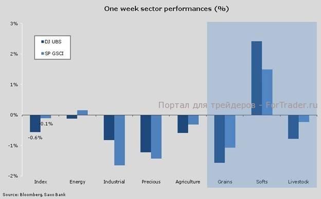 Индекс Dow Jones UBS завершил в минусе четвертую неделю подряд, не сумев воспользоваться слабостью доллара в этот период. Как видно на приведенном выше графике, во всех секторах, за исключением выращиваемых товаров, наблюдались продажи. Если говорить о конкретных сырьевых товарах среди выращиваемых культур, то сахар, кофе и хлопок вышли в лидеры, в то время как кукуруза и соевые бобы показали худшие результаты на фоне быстро приближающегося сбора урожая, который может оказаться очень высоким.
