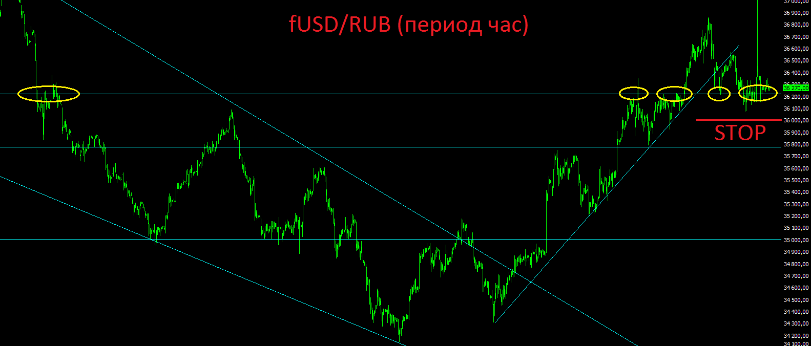 Локальная техническая картина по фьючерсу на валютную пару доллар-рубль сейчас выглядит следующим образом. До тех пор, пока цена держится выше отметки 36000 пунктов стоит удерживать длинные позиции по данному инструменту, т.е. делать ставку на ослабление российской валюты. В случае пробоя вниз отметки 36000 пунктов придётся пересматривать негативный взгляд по рублю.