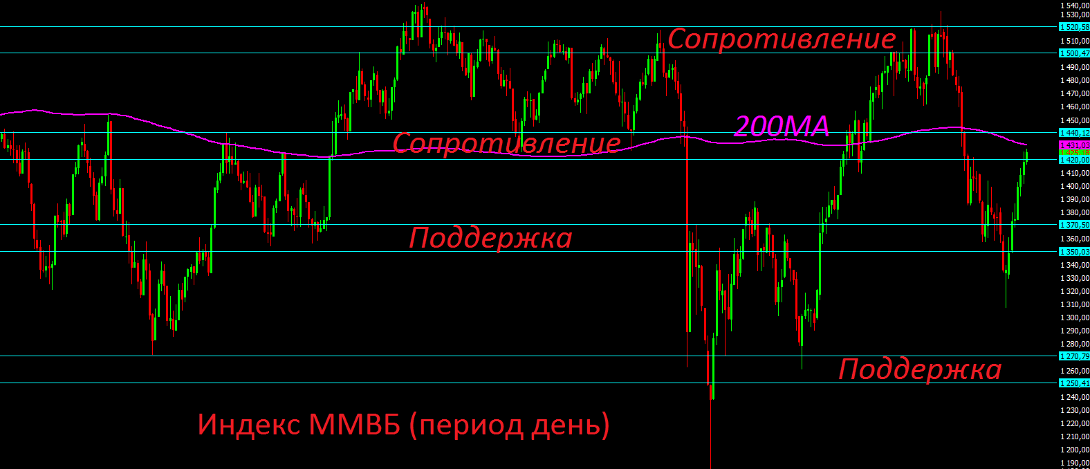 Если взглянуть на технический срез дневного графика индекса ММВБ, то прекрасно видно, что после семи дней роста цена достигла диапазона сопротивления 1420-1440 пунктов и 200-дневной скользящей средней. Вблизи текущих ценовых уровней стоит готовиться к консолидации на 1-2 дня и возможно к последующему развороту вниз.