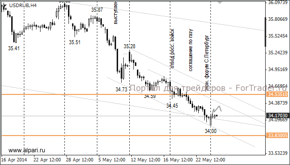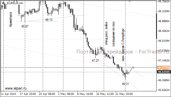 Кремль занял выжидательную позицию и внимательно следит за решениями Порошенко. От него будет зависеть дальнейшее сотрудничество. А пока на ближайшие два дня по рублёвым парам ожидается коррекционный рост. Цели для коррекции: евро – 46,80, доллар – 34,30 руб.
