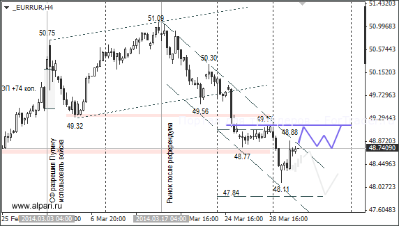 Целевая область 34,65 руб. для пары доллара остаётся актуальной. Для евро это уровень 47,84 руб. Если внутренний валютный рынок откроется ослаблением рубля, тогда на время про уровни 34,65 и 47,84 придётся забыть. Доллар и евро по отношению к рублю будут восстанавливать потери до уровней 35,78 и 49,17. Дополнительные сценарии нанесены на графики.