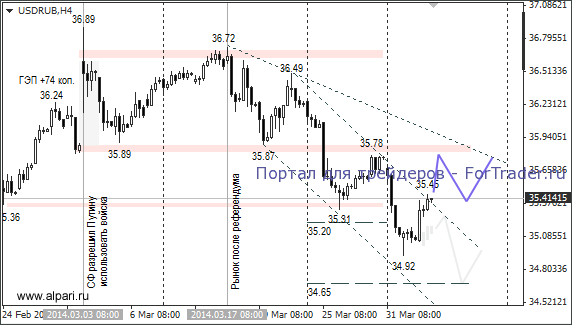 В среду по итогам торговой сессии на Московской бирже курс доллара расчётами «завтра» вырос на 31,30 коп, до 35,4125 рубля, курс евро вырос на 36,75 копейки, до 48,7675 рубля. Ослабление рубля было вызвано техническими факторами и падением стоимости нефти. Котировки на нефть сорта Brent снижались на американской сессии до 103,93 (-1,3 доллара). Дополнительное давление на рубль оказало сообщение, что Минфин РФ хочет возобновить покупку иностранной валюты для Резервного фонда. Минфин должен до конца мая купить валюты на 212,2 млрд. рублей. К моменту приостановки закупок Минфин успел приобрести 978 млн долларов на 38 млрд рублей. По сравнению с проведенными валютными интервенциями в марте это копейки.