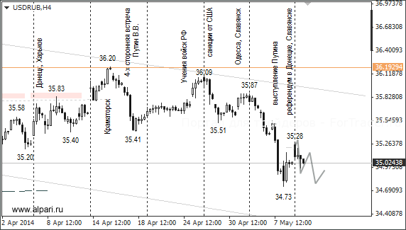 В понедельник после майских каникул и проведенных референдумов в Донецкой и Луганской областях Украины, курс доллар/рубль открылся гэпом в районе 35,25. Трейдеры вяло отреагировали на референдумы, и в условиях низкой активности на рынке Форекс, продажи рубля быстро сменились его покупками. В течение торговой сессии курс евро/рубль снижался до 48,13. Курс доллар/рубль снизился до 35 рублей.