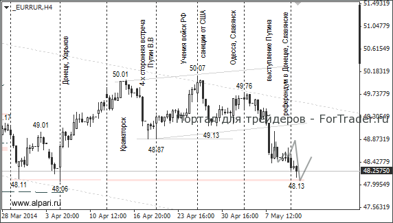 Вчера руководство Донецкой народной республики объявило о суверенитете ДНР и обратилось к РФ с просьбой о включении в состав России. Безусловно, это негативный фактор для российской валюты, но, если исходить из высказываний G7, что Россия виновата всегда и во всем, то рубль может проигнорировать все новые санкции. Вашингтон обещал ввести экономические санкции, если из-за состоявшихся референдумов в двух областях сорвутся намеченные на 25 мая президентские выборы на Украине.