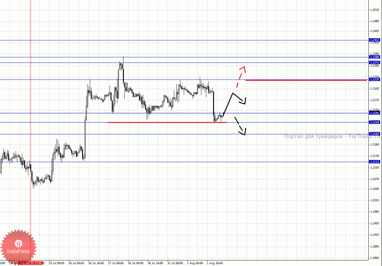 По паре Евро/Доллар важными уровнями являются: 1.2432, 1.2388, 1.2373, 1.2329, 1.2242, 1.2218, 1.2187 и 1.2115. Здесь мы продолжаем следить за восходящей структурой от 24 июля. Продолжения движения кверху ожидаем после пробоя 1.2329, в данном случае цель 1.2373, в коридоре 1.2373 – 1.2388 консолидация цены. Потенциальным значением для верха считаем уровень 1.2432, по достижении которого ожидаем откат книзу. Краткосрочное нисходящее движение возможно в коридоре 1.2242 – 1.2218, пробой последнего значения приведет к углубленной коррекции, здесь цель – 1.2187, от этого уровня высока вероятность разворота кверху, его пробой будет располагать к развитию нисходящей структуры. Уровень 1.2115 интересен с точки зрения среднесрочной перспективы.