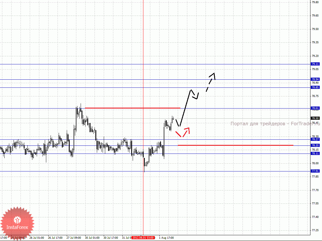 По паре Доллар/Иена ключевыми уровнями являются: 79.11, 78.94, 78.85, 78.61, 78.27, 78.20, 78.11 и 77.91. Здесь восходящую структуру от 1 августа мы рассматриваем в качестве потенциала для развития цикла. Продолжения движения кверху ожидаем после пробоя 78.61, в данном случае цель – 78.85, в коридоре 78.85 – 78.94 консолидация цены. Потенциальным значением для верха считаем уровень 79.11, по достижении которого ожидаем откат книзу. Краткосрочное нисходящее движение возможно в коридоре 78.27 – 78.20, пробой последнего значения приведет к углубленной коррекции, здесь цель 78.11, пробой которого, в свою очередь, отменит развитие восходящей структуры и в данном случае потенциальная цель – 77.91.