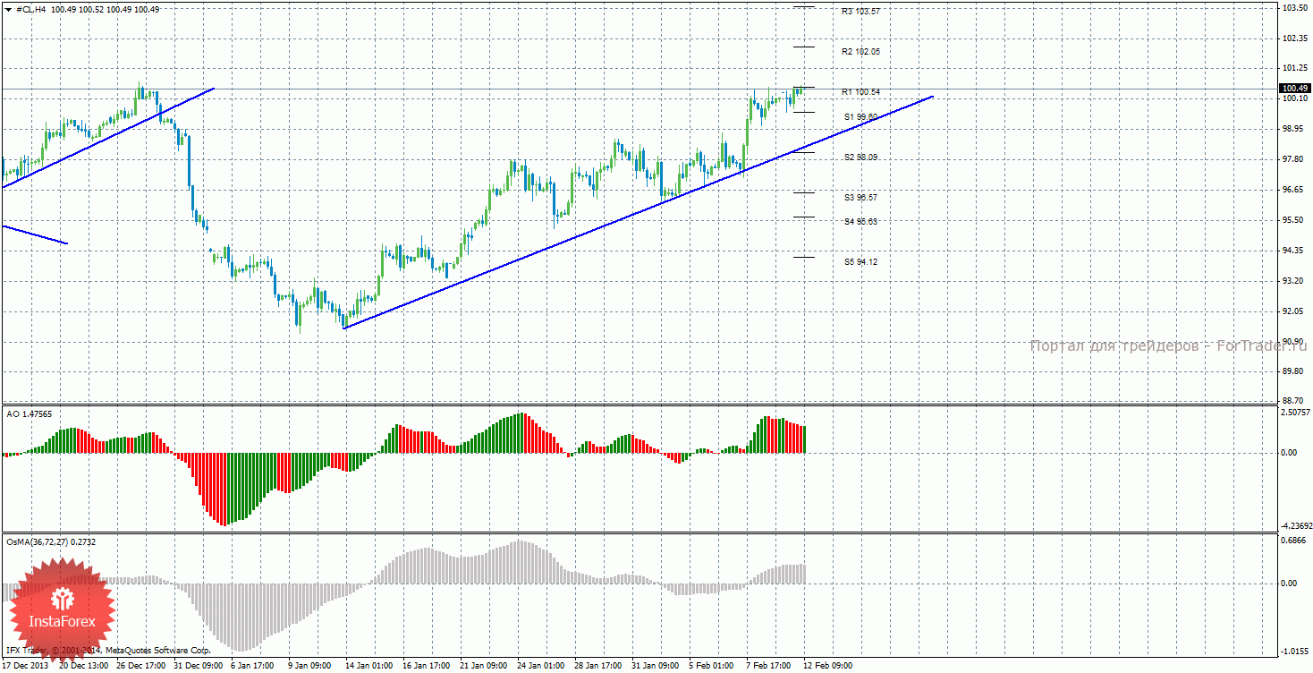 Анализ сырой нефти за 12 февраля показывает, что цена продолжает восходящее движение, но никак не может преодолеть уровень сопротивления R1. Восходящее движение может продолжиться с целями R2 – 102,05 и R3 – 103,57, если цена закрепится выше уровня 100,54. Может начаться нисходящая коррекция с целями 98,09 и 96,57, в случае, если цена закрепится ниже уровня 99,60. Восходящая линия тренда вновь оказывает поддержку торгующим на повышение, цена располагается выше нее. Индикатор Awesome показывает текущее нисходящее движение, так как последний закрытый бар красного цвета. OsMA же направлен вверх, что говорит о восходящем характере движения в более долгосрочном плане. Если цена отскочит от уровня 100,54, это может засвидетельствовать виток коррекционного движения.
