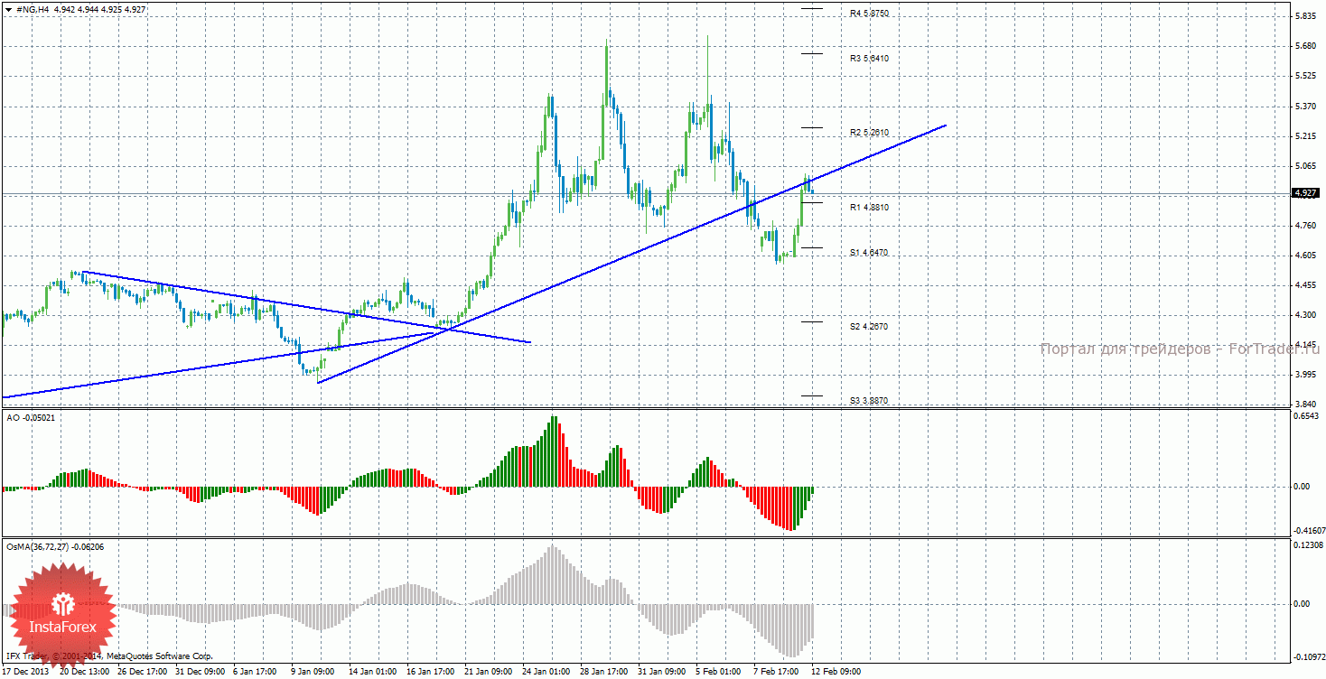 Анализ природного газа за 12 февраля показывает, что цена начала восходящую коррекцию и закрепилась выше уровня сопротивления 4,3810. На данный момент актуально нисходящее движение с целями уровни поддержки S1 — 4,6470 и S2 – 4,2670, если цена закрепится ниже уровня 4,3810. Целями для возможного продолжения восходящей коррекции выступают уровни сопротивления 5,2610 и 5,6410, если цена останется выше уровня 4,3810. Восходящая линия тренда больше не оказывает поддержку торгующим на повышение, цена закрепилась ниже нее, тенденция на рынке поменялась на нисходящую. Индикатор Awesome показывает локальное восходящее движение, последний закрытый бар окрашен в зеленый цвет. OsMA также направлен вверх, что сигнализирует о восходящем движении цены на газ и в более долгосрочной перспективе. Если цена закрепится ниже уровня 4,3810, это может спровоцировать возобновление нисходящего движения.