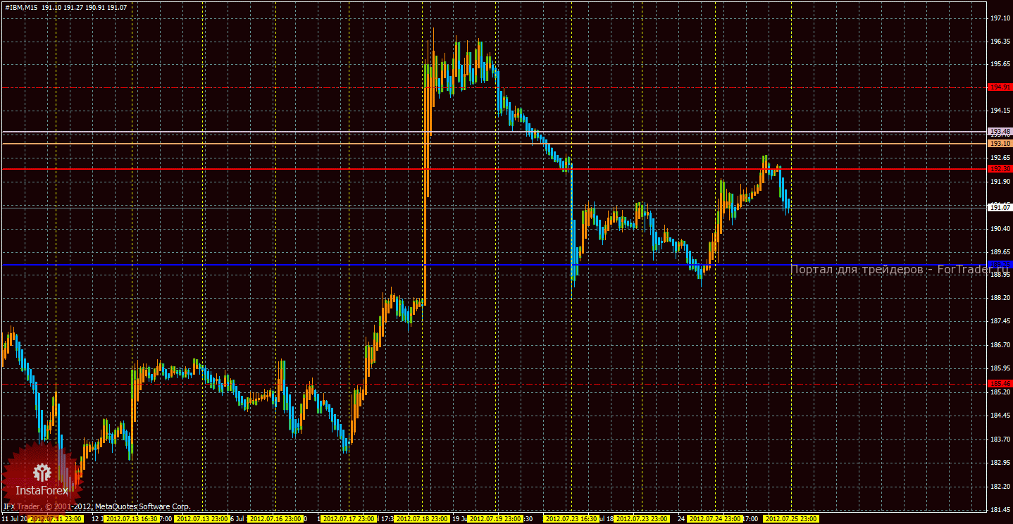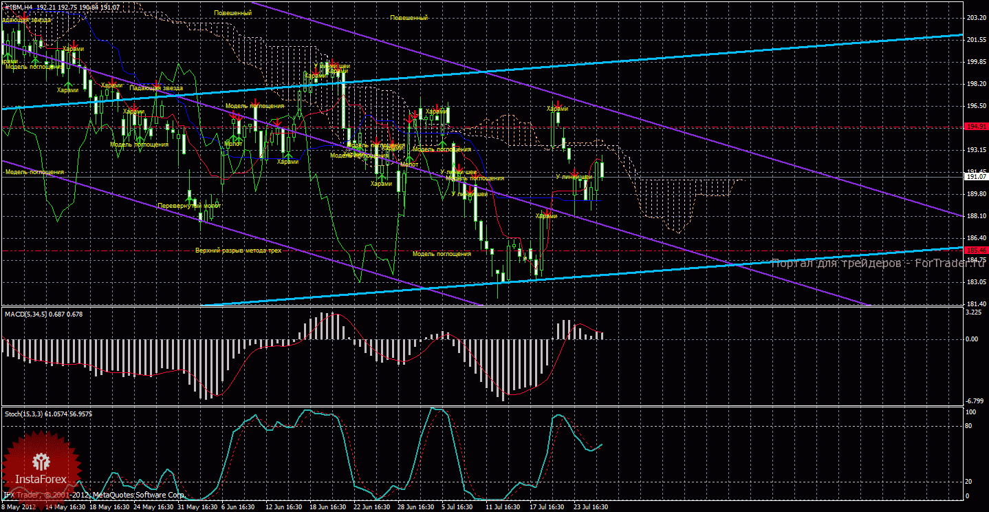 Анализируя график движения цены акций компании IBM Corporation, видим, что инструмент пытается возобновить восходящее движение и усилить текущий сигнал на покупку. Каналы линейной регрессии направлены в разные стороны, что позволяет нам рассматривать как длинные, так и короткие позиции на рынке. Текущий сигнал на покупку слабый (так как цена опустилась ниже облака Ишимоку), поэтому отрабатывать его на текущем таймфрейме можно будет только выше облака Ишимоку. Первой целью, таким образом, является уровень сопротивления 210,64, цель довольно дальняя. Киджун-сен выступает ориентиром для выставления стоп-лосс при торговле на повышение, закрепление цены ниже него ослабит текущий сигнал. Была сформирована медвежья «Харами», которая очень точно указала разворот курса вниз, также была сформирована «У линии Шеи», однако, из-за не закрепления цены ниже Киджун-сен, это комбинация может оказаться ложной. MACD направлен вниз, что сигнализирует о текущем коррекционном движении, поэтому рассматривать длинные позиции этот индикатор сейчас не позволяет, но в любом случае ниже облака Ишимоку заходить в лонги не рекомендуется. Стохастик покинул область перекупленности и понижается, что также указывает на нисходящее движение.