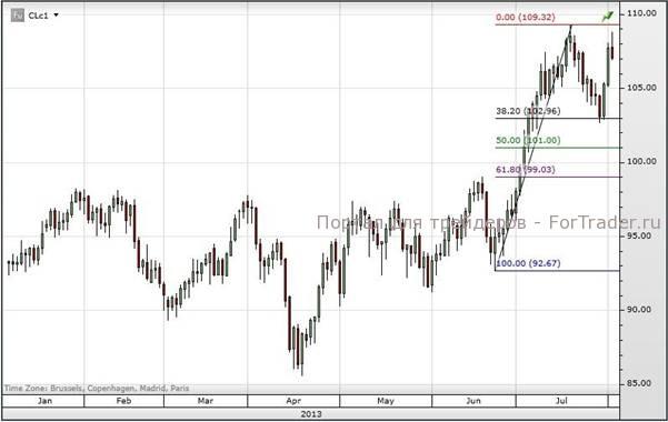 Цена на нефть WTI сейчас зажата между 103 и 109,30 доллара за баррель. Прорыв вниз завершит формирование двойной вершины, что указывает на коррекцию, которая способна вернуть цену к 97 долларам. Новый максимум будет означать движение первоначально к вершине 2012 года на уровне 110,55, а затем к вершине 2011 года на отметке 114,83, которая была установлена в период войны в Ливии в марте 2011 года.