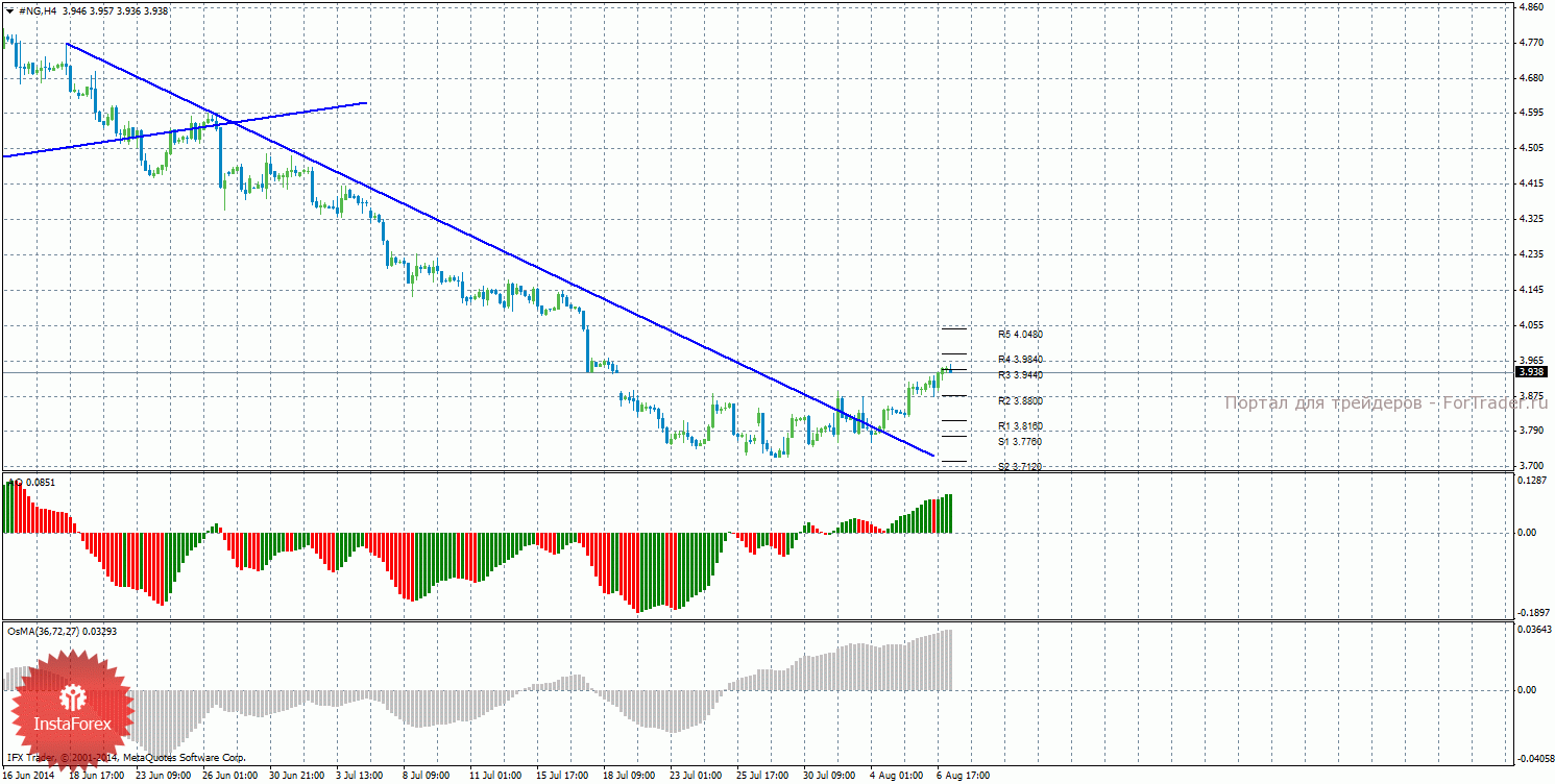 Анализ природного газа за 7 августа показывает, что цена отработала уровень сопротивления R3 и может от него отскочить и начать нисходящую коррекцию. На данный момент актуально восходящее движение с целями уровни сопротивления R4 –3,9840 и R5 – 4,0480, если цена закрепится выше уровня 3,9440. Целями для начала нисходящей коррекции выступают уровни 3,8880 и 3,8160, если цена отскочит от уровня 3,9440. Нисходящая линия тренда больше не оказывает поддержку торгующим на понижение, цена закрепилась выше, стали актуальными ордера на покупку. Индикатор Awesome показывает локальное восходящее движение, последний закрытый бар окрашен в зеленый цвет. OsMA также направлен наверх, что сигнализирует о восходящем движении цены на газ и в более долгосрочной перспективе. Отскок от уровня 3,9440 может спровоцировать виток коррекционного движения.