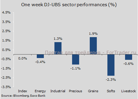 В целом на прошлой неделе сырьевые товары завершили торги без видимых изменений, причем сырьевой индекс Dow Jones-UBS зарегистрировал практически идеальное «флэтовое» значение по итогам недели (как показывает график изменения цен в полдень в пятницу). Впрочем, сырье демонстрировало немало движений на фоне нисходящей коррекции цен на кофе Арабика, которая произошла, несмотря на продолжающееся беспокойство рынков по поводу погодных условий в Бразилии и заболевания сельскохозяйственных культур в Центральной Америке, а также долгосрочные опасения относительно влияния последствий урагана «Эль-Ниньо» на погоду в Центральной и Южной Америке. Что касается других товаров, американская кукуруза резко восстановилась после падения на прошлой неделе, вызванного задержкой посадки, тогда как пшеница обновляет максимумы текущего года в ожидании сегодняшнего отчета по оценке урожая, который прольет свет на масштабы вреда, который ощутили на себе озимые культуры. Интересно заметить, что торговля на рынках энергоносителей протекала весьма спокойно, невзирая на хладнокровие Путина в конфронтации по вопросу Украины.