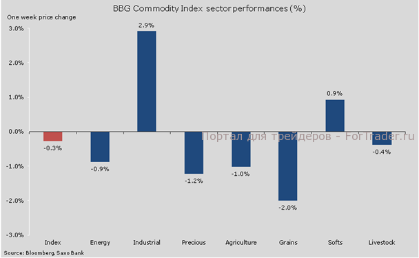 Диверсифицированный сырьевой индекс BBG за неделю практически не изменился: рост на рынке промышленных металлов, в частности цинка и алюминия, был компенсирован потерями в энергетическом секторе и секторе драгоценных металлов. В сельскохозяйственном секторе динамика была смешанная, некоторые ключевые культуры, например кукуруза, продолжили свое падение, а вот выращиваемые товары во главе с кофе и какао значительно укрепили свои позиции.