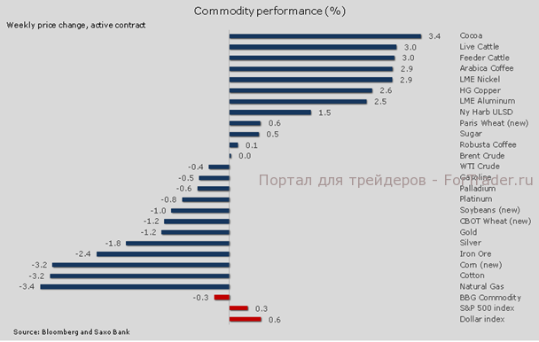 В лидерах на прошлой неделе оказались кофе сорта Арабика и какао. В первом квартале произошло стремительное повышение цен. Причиной послужила засуха в Бразилии, крупнейшем в мире производителе высококачественных бобов, которая привела к сокращению урожая. После того как цена откатилась от максимума на 50%, рост возобновился, на этот раз в связи с сообщениями о том, что засуха в Бразилии могла сильно повредить кофейные деревья, из-за чего прогнозы будущего урожая могут быть пересмотрены в меньшую сторону.