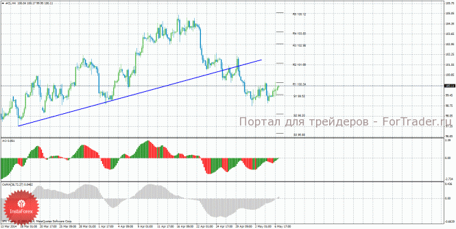 Анализ сырой нефти за 7 мая показывает, что цена начала новый виток коррекционного движения, закрепившись выше уровня 99,52. Нисходящее движение может возобновиться с целями S2 – 98,20 и S3 – 96,88, если цена закрепится ниже уровня 99,52. Может продолжиться восходящая коррекция с целями уровни 100,34 и 101,66, если цена останется выше уровня 99,52. Цена закрепилась ниже восходящей линии, поэтому она более не актуальна. Нисходящей линии тренда пока что нет. Индикатор Awesome показывает текущее восходящее движение, так как последний закрытый бар зеленого цвета. OsMA также направлен наверх, что говорит о восходящем характере движения и в более долгосрочном плане. Отскок цены от уровня 100,34 может спровоцировать возобновление нисходящего движения.