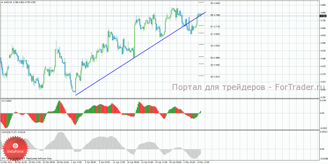 По этому инструменту сейчас рекомендуется рассматривать варианты коротких позиций с целями 4,7150 и 4,6630. Стоп лосс-выставляется выше ближайшего уровня сопротивления. Рекомендуется выставить стоп-лосс в зону безубытка при прибыльности сделки 100-200 пунктов. Если цена отскочит от уровня 4,7980, это может засвидетельствовать возобновление нисходящего движения, как и разворот вниз Awesome или OsMA. Ордера на покупку пока что не актуальны.