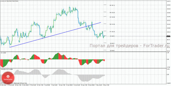 В ходе проведенного анализа движения цены на нефть, можно сделать вывод, что сейчас можно рассматривать ордера на продажу с целями 98,20 и 96,88. Стоп-лосс выставляем выше ближайшего уровня сопротивления. При заходе сделки в прибыльность в безубыток. Если цена закрепится выше уровня 99,52, это может засвидетельствовать возобновление коррекционного движения, как и разворот наверх Awesome. Длинные позиции сейчас не актуальны.