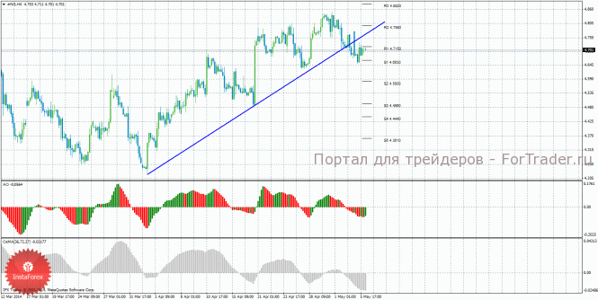 Анализ природного газа за 6 мая показывает, что цена продолжает не слишком сильное нисходящее движение, но находится между уровнями S1 и R1. На данный момент актуально нисходящее движение с целями уровни поддержки S2 – 4,5800 и S3 – 4,4960, если цена закрепится ниже уровня 4,6630. Целями для начала восходящей коррекции выступают уровни сопротивления 4,7980 и 4,8820, если цена закрепится выше уровня 4,7150. Восходящая линия тренда больше не оказывает поддержку торгующим на повышение. Цена закрепилась ниже нее, поэтому может продолжиться нисходящее движение и стали актуальными шорты. Индикатор Awesome показывает локальное восходящее движение, последний закрытый бар окрашен в зеленый цвет. OsMA направлен вниз, что сигнализирует о нисходящем движении цены на газ в более долгосрочной перспективе. Если цена отскочит от уровня сопротивления 4,7150, это может спровоцировать продолжение нисходящего движения.