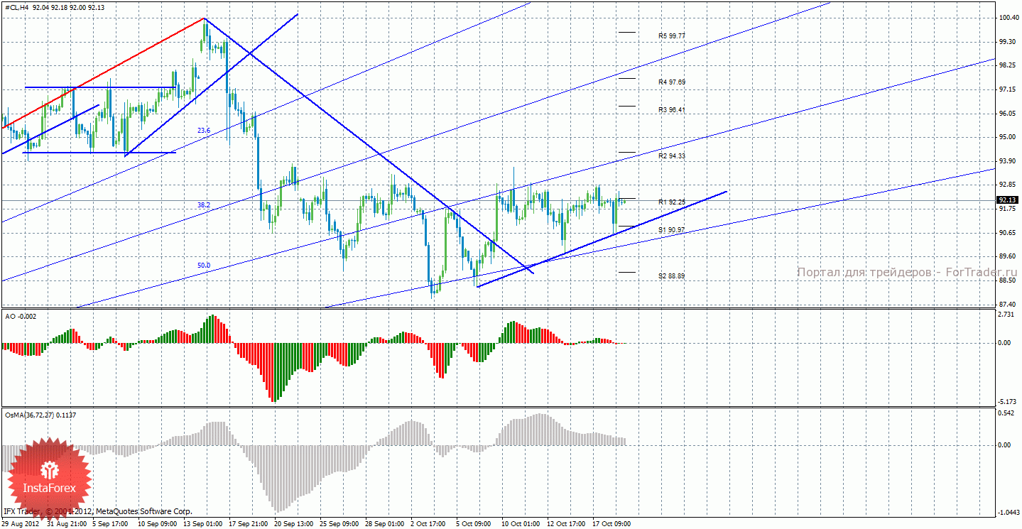 Анализ сырой нефти за 19 октября показывает, что цена находится выше нисходящей линии тренда и продолжает пока что небольшое восходящее движение с нередкими коррекциями. Нисходящая линия тренда более не актуальна, так как цена закрепилась выше нее, зато построена новая восходящая линия тренда, а значит, восходящее движение имеет хорошие перспективы. Восходящее движение может продолжиться с целями 94,33 и 96,41, но для этого нужно закрепление цены выше 92,25. Нахождение цены ниже уровня R1, сигнализирует о продолжении нисходящей коррекции с целями 90,97 и 88,89. Индикатор Awesome показывает текущее нисходящее движение, так как последний закрытый бар красного цвета. OsMA также развернулся вниз, что говорит о нисходящем характере движения и в более долгосрочном плане.