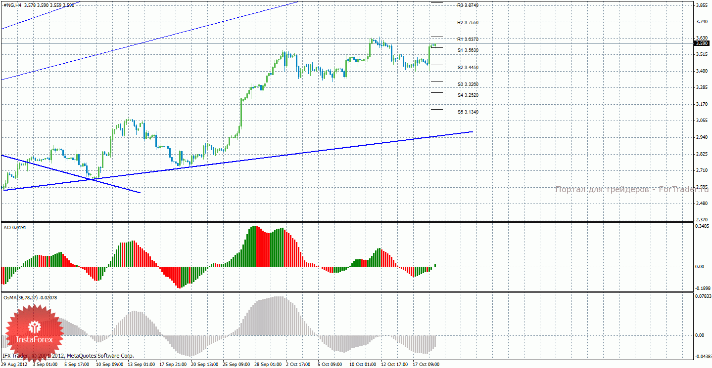 Анализ природного газа за 19 октября показывает, что цена сохраняет перспективы восходящего движения и на данный момент, возможно, завершила коррекцию. Целями для продолжения восходящего движения сейчас выступают 3,6370 и 3,7550. Закрепление цены ниже уровня 3,5630 может вновь указать на коррекцию с целями 3,4450 и 3,3260. Восходящая линия тренда поддерживает торгующих на повышение, но у нее достаточно малый угол наклона и цена довольно далеко от нее находится, хотя и слабой ее назвать нельзя. Индикатор Awesome показывает локальное восходящее движение, последний закрытый бар окрашен в зеленый цвет, что и сигнализирует о возможном завершении коррекции. OsMA также направлен вверх, что сигнализирует о восходящем движении цены на газ и в более долгосрочной перспективе.