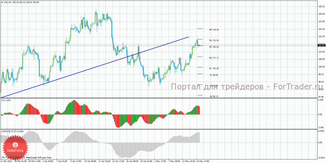 Анализ сырой нефти за 15 мая показывает, что цена продолжает коррекционное движение и отработала уровень сопротивления R4 – 102,54. Нисходящее движение может возобновиться с целями R2 – 101,17 и R1 – 100,32, если цена закрепится ниже уровня 102,02. Может продолжиться восходящая коррекция с целями уровни 102,54 и 103,39, если цена отскочит от уровня 102,02. Цена закрепилась ниже восходящей линии, поэтому она более не актуальна. Нисходящей линии тренда на данный момент нет. Индикатор Awesome показывает текущее нисходящее движение, так как последний закрытый бар красного цвета. OsMA направлен вверх, что говорит о восходящем характере движения в более долгосрочном плане. Отскок цены от уровня 102,02 может спровоцировать продолжение коррекционного движения.