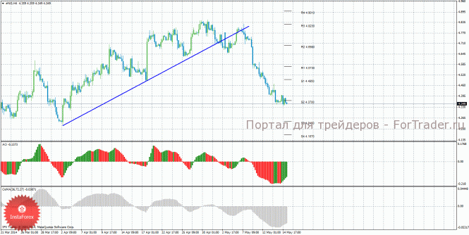 Анализ природного газа за 15 мая показывает, что цена продолжает сильное нисходящее движение и закрепилась ниже уровня поддержки S2 – 4,3700. На данный момент актуально нисходящее движение с целями уровни поддержки S3 – 4,2450 и S4 – 4,1670, если цена останется ниже уровня 4,3700. Целями для начала восходящей коррекции выступают уровни сопротивления 4,4950 и 4,5730, если цена закрепится выше уровня 4,3700. Восходящая линия тренда больше не оказывает поддержку торгующим на повышение. Цена закрепилась ниже нее, поэтому может продолжиться нисходящее движение и являются актуальными шорты. Индикатор Awesome показывает локальное восходящее движение, последний закрытый бар окрашен в зеленый цвет. OsMA также направлен вверх, что сигнализирует о восходящем движении цены на газ и в более долгосрочной перспективе. Оба индикатора начали разряжаться, так как находятся на своих минимальных значениях. Если цена закрепится выше уровня 4,3700, это может спровоцировать виток коррекционного движения.