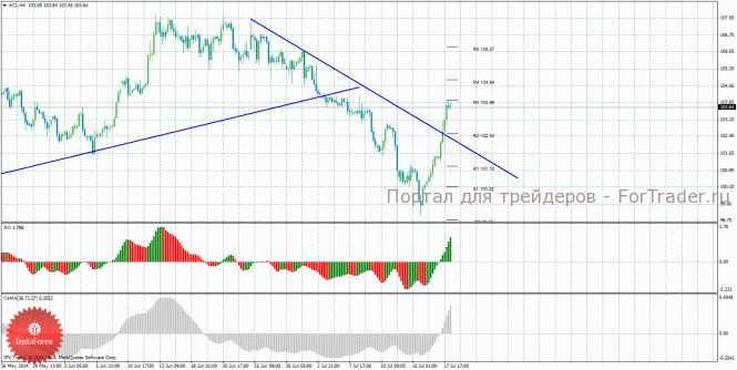 Анализ сырой нефти за 18 июля показывает, что цена преодолела нисходящую линию тренда, на данный момент стали актуальными длинные позиции. Восходящее движение может продолжиться с целями уровни сопротивления R4 – 104,84 и R5 – 106,27, если цена закрепится выше уровня 103,96. Целями для начала нисходящей коррекции выступают уровни 102,53 и 101,10, если цена отскочит от уровня 103,96. Цена закрепилась выше нисходящей линии тренда, поэтому тенденция на рынке поменялась на восходящую и стали актуальными ордера на покупку. Индикатор Awesome показывает текущее восходящее движение, так как последний закрытый бар зеленого цвета. OsMA также направлен наверх, что говорит о восходящем характере движения и в более долгосрочном плане. Если цена отскочит от уровня 103,96, это может спровоцировать начало коррекционного движения.