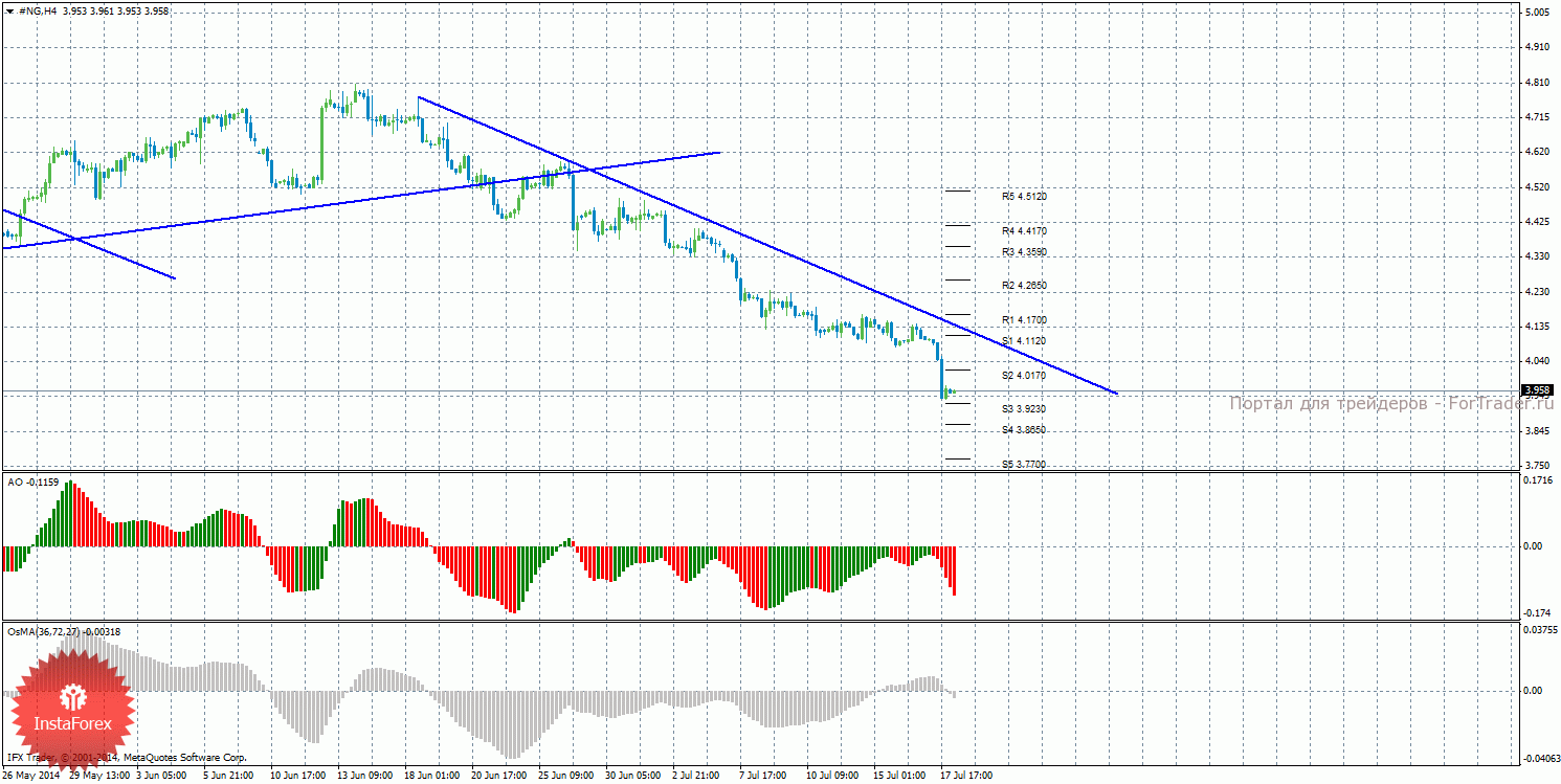 Анализ природного газа за 18 июля показывает, что цена продолжает нисходящее движение и закрепилась ниже уровня поддержки S2. На данный момент актуально нисходящее движение с целями уровни поддержки S3 –3,9230 и S4 – 3,8650, если цена останется ниже уровня 4,0170. Целями для начала нового витка восходящей коррекции выступают уровни 4,0170 и 4,1120, если цена отскочит от уровня 3,9230. Построена нисходящая линия тренда, которая оказывает поддержку торгующим на понижение и делает актуальными ордера на продажу. Индикатор Awesome показывает локальное нисходящее движение, последний закрытый бар окрашен в красный цвет. OsMA также развернулся вниз, что сигнализирует о нисходящем движении цены на газ и в более долгосрочной перспективе. Отскок цены от уровня 3,9230 может спровоцировать начало восходящей коррекции.