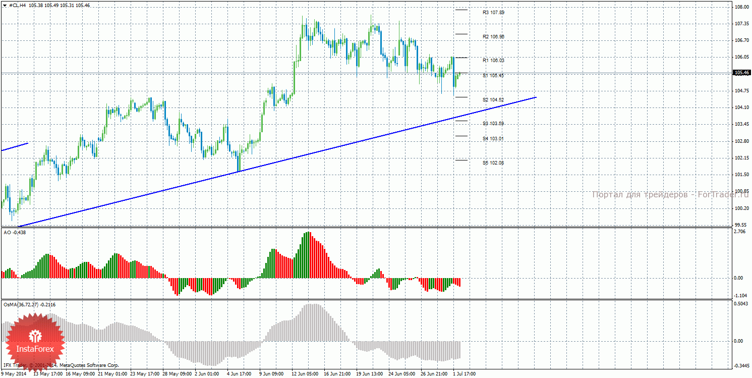 В ходе проведенного анализа движения цены на нефть, можно сделать вывод, что сейчас можно рассматривать ордера на покупку с целями 106,03 и 106,96. Стоп лосс выставляем ниже ближайшего уровня поддержки. При заходе сделки в прибыльность в безубыток. Если цена закрепится выше уровня 105,45, это может засвидетельствовать возобновление восходящего движения, как и разворот наверх индикатора Awesome. Короткие позиции сейчас не актуальны.